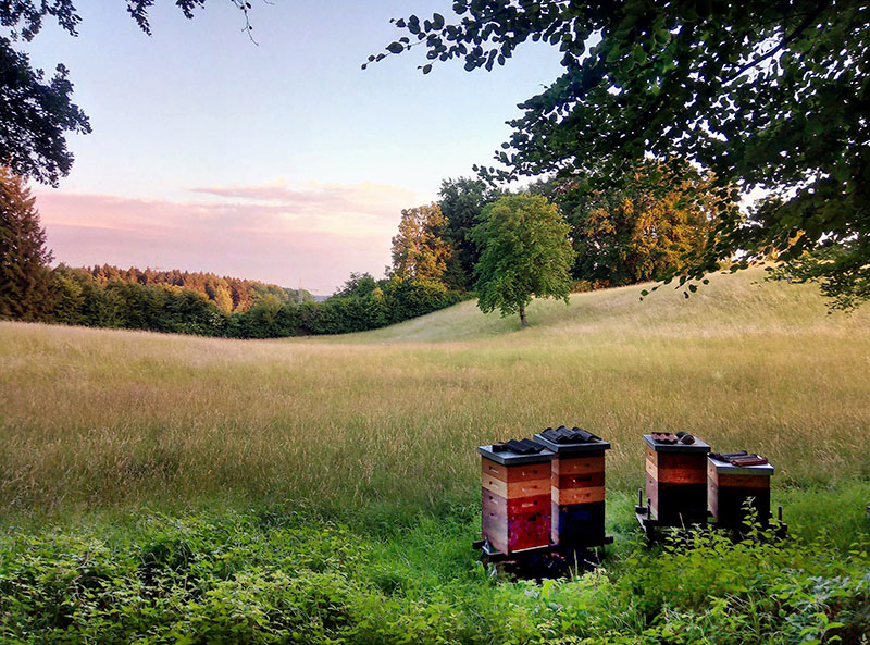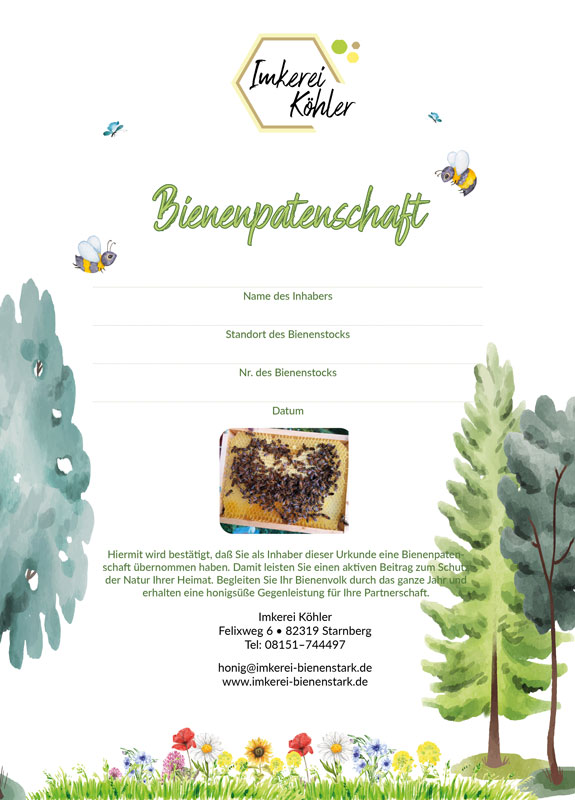 Bitte Text liefern über Bienenpatenschaft.. auf einer alten Kartoffelkiste befand. Eigentlich hatte ich noch keine richtige Ahnung von Bienenhaltung und Honig. Zum Glück konnte ich jederzeit meine beiden „Bienenpaten“ um Rat fragen, und so hat meine Begeisterung für die Imkerei bis heute nicht abgenommen. Auf unserem Grundstück ist auch ein Imkerei-Wirtschaftsgebäude entstanden, in dem Honigernte, Verarbeitung und auch eine Vermarktung stattfinden.